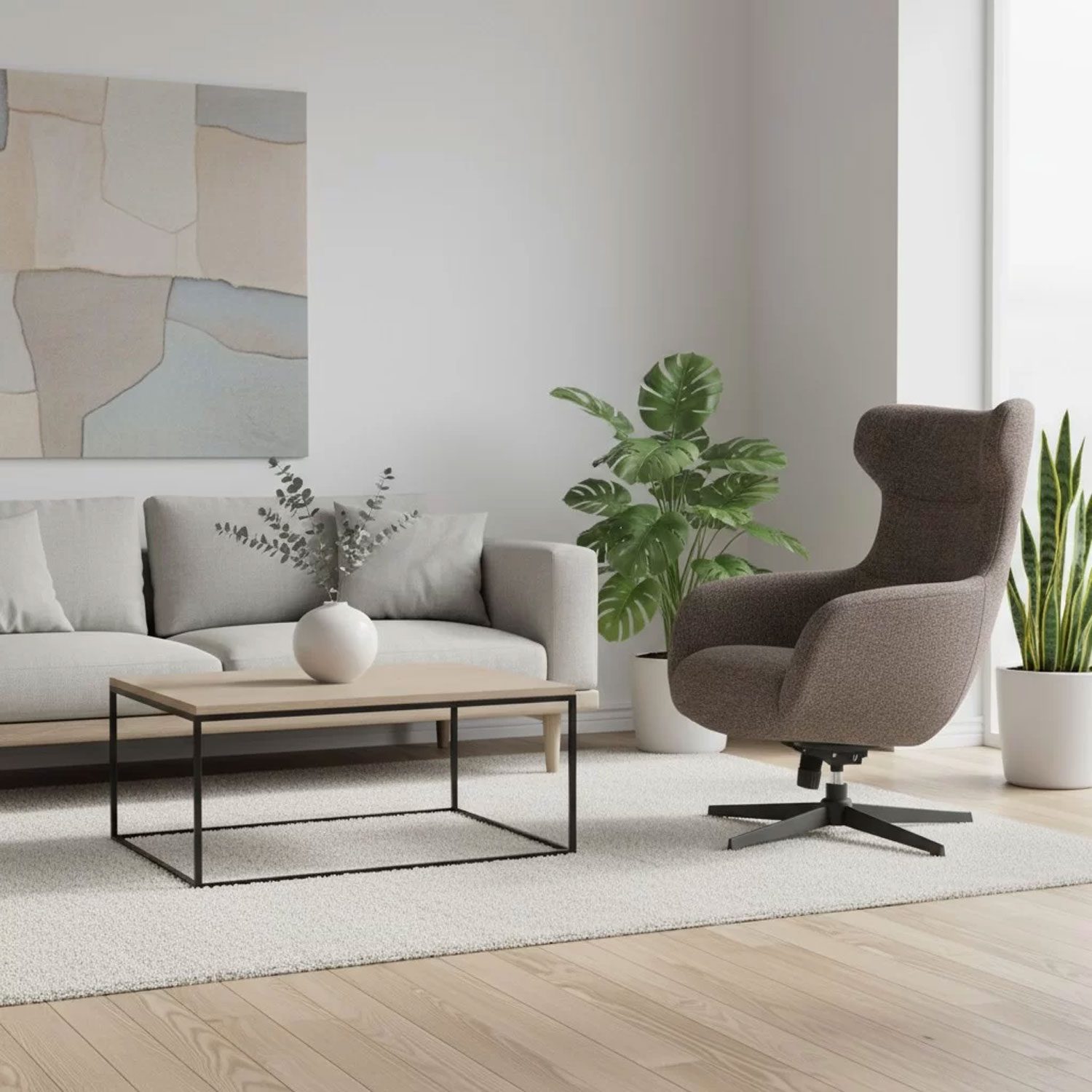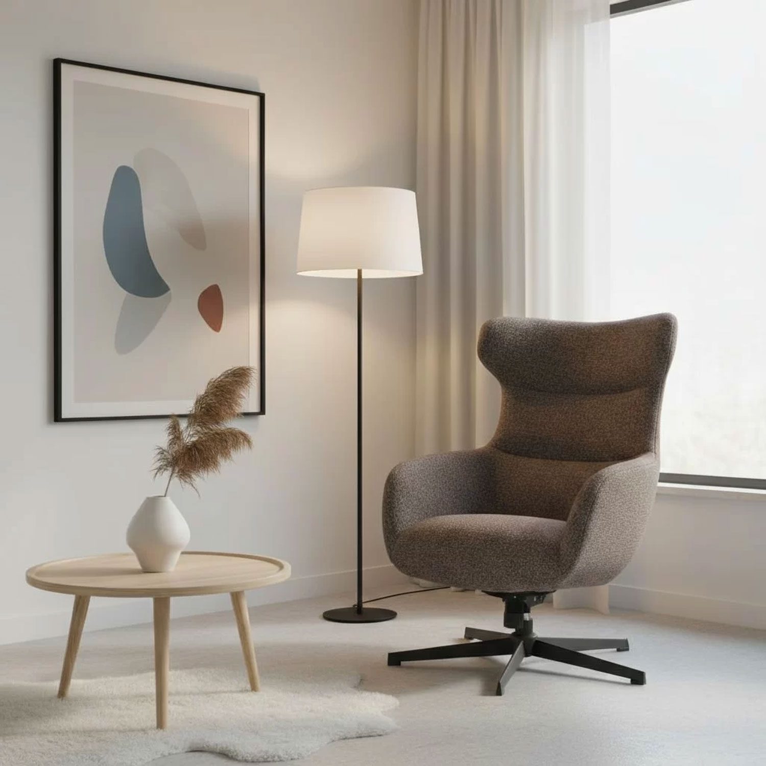 Pyörivällä jalustalla ja keinuvalla mekanismilla varustettu lepotuoli on tyylikäs valinta olohuoneeseen.
