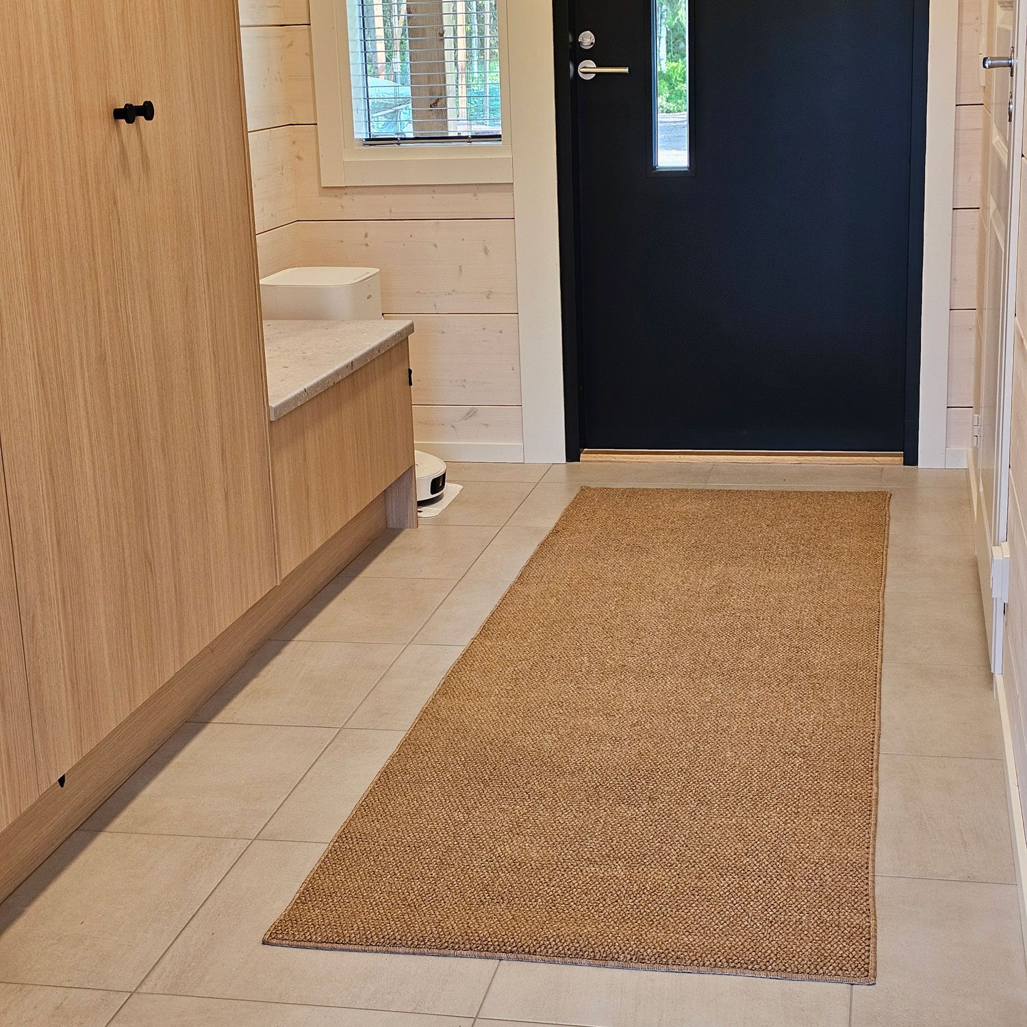 Linnea on sileäpintainen kudottu matto, joka sopii niin eteiseen, keittiöön kuin käytävään. Ohut ja joustava liukuestepohja pitää maton napakasti paikallaan myös sileillä lattiapinnoilla.