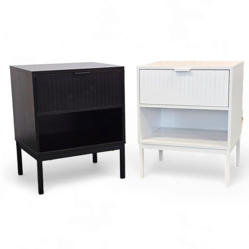 Yöpöytä on saatavana kahdessa klassisessa värissä, valkoisena ja mustana. Materiaali: 3D, puukuvioitua melamiinia. Jalka metallia.