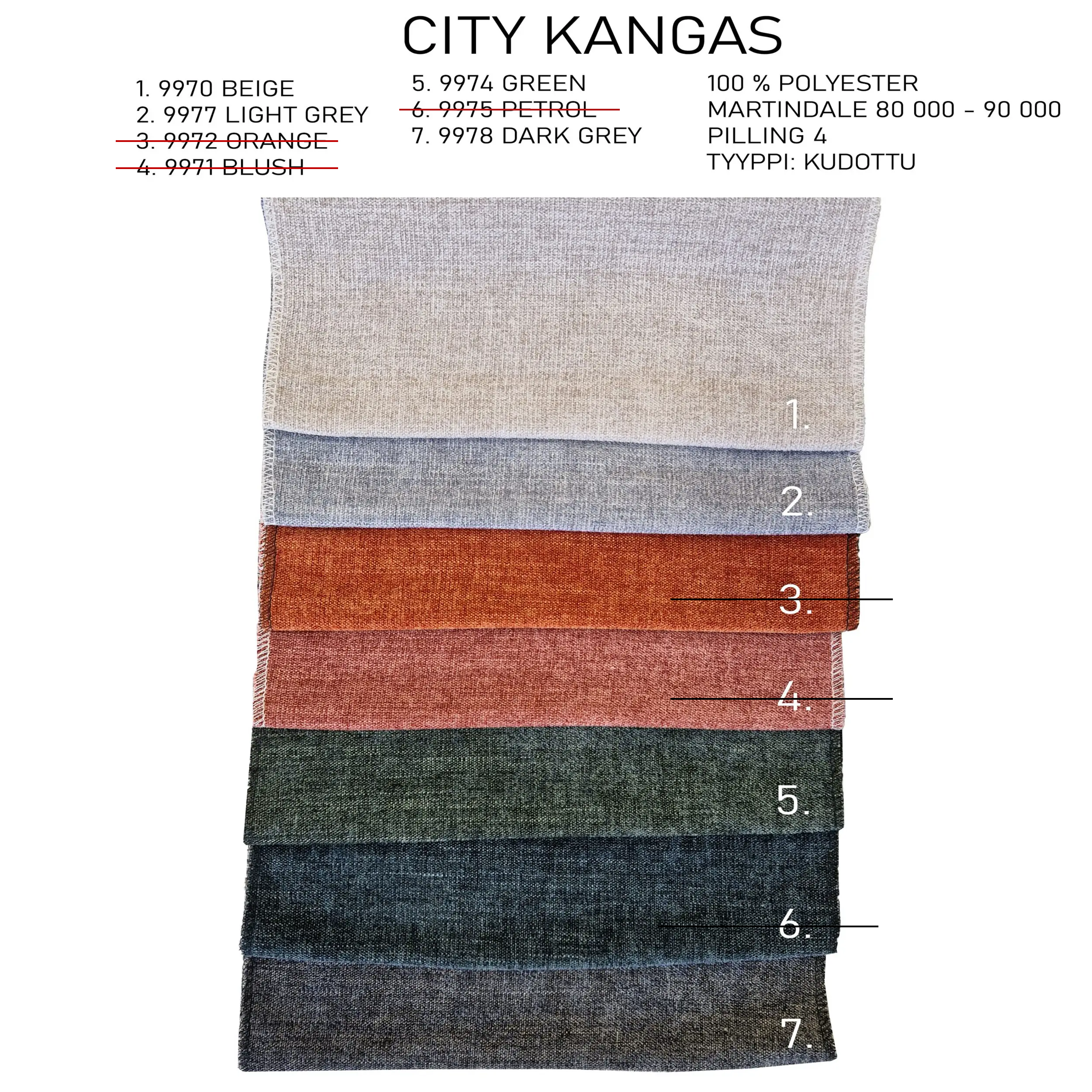 City -kangas on ihanan pehmeä, sileä kangas. Näyttää hieman samettimaiselta elävyytensä ansiosta. Kangastiedot: 80 000 - 90 000 Martindale. Pillinki 4, valonkestävyys 5. Materiaali 100% polyesteri. Kevyt likaahylkivyyskäsittely.