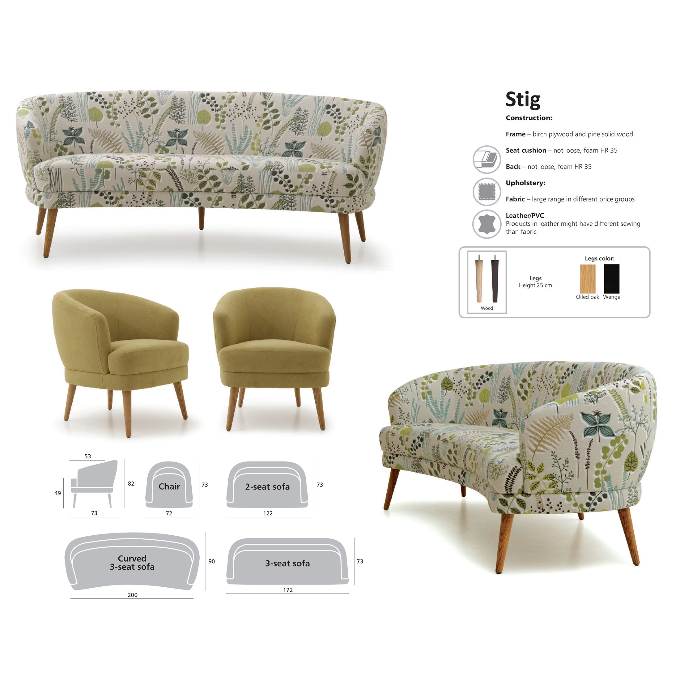 Rertohenkinen Stig sohva korkeilla jaloilla ihastuttaa kaarevalla selkänojan muotoilulla ja se sopii hyvin ikkunan alle tai erkkeriin. Sohvan rakenne on siroudesta huolimatta vahva, sillä runko on valmistettu puusta ja vanerista.